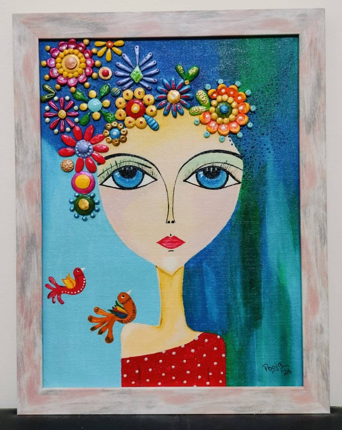 Captivating art piece featuring doll-like details, crafted with Shilpkar techniques and vibrant fabric colors.
